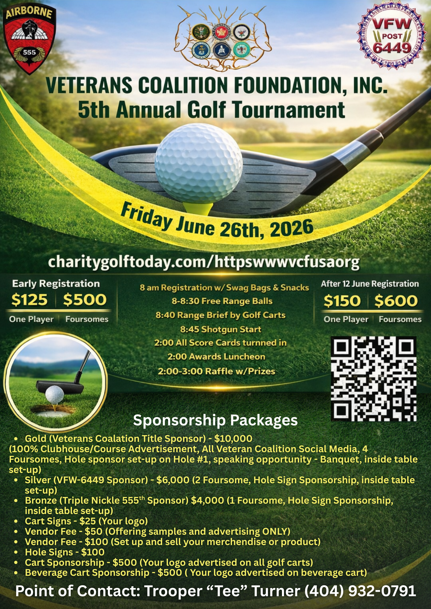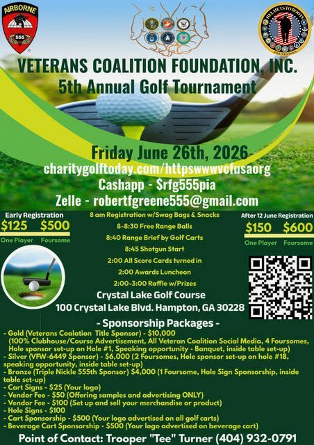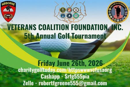 Support the Veterans Coalition Foundation INC. while gaining valuable exposure at our 5th Annual Golf Tournament. We offer a variety of sponsorship and vendor packages designed to highlight your business or organization throughout the event—from on-course signage and cart branding to social media recognition and speaking opportunities at the banquet. Your participation directly supports our mission to serve and honor our veterans while connecting you with a strong, engaged community.